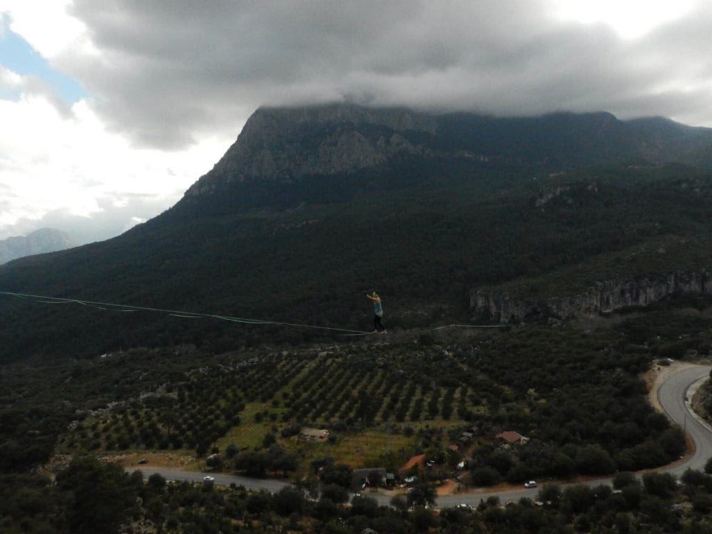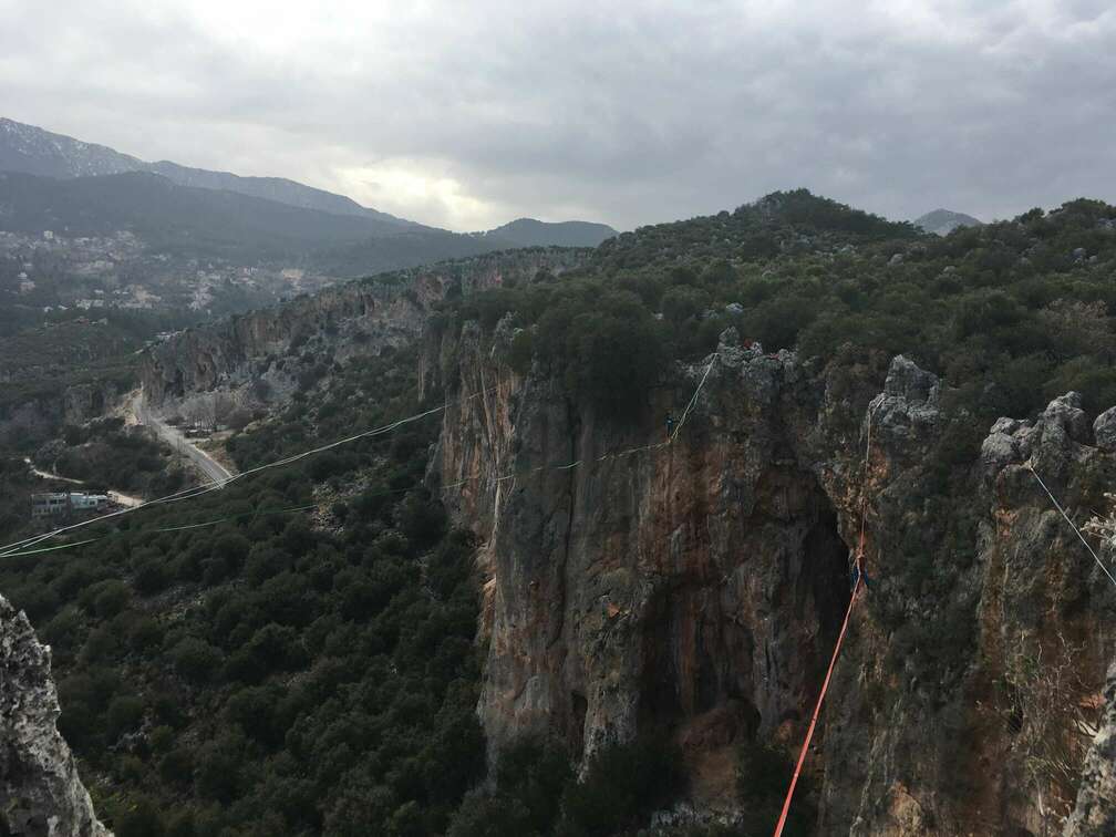 Here, just like at Anatoli, pay attention to the stone mounds. When you reach the rock with a single handline, go down, towards the river. Down below, turn right. The spot is located near a cave, and numerous climbing routes make staying here a lot more attractive. There are two tapes hanging there, recessed into greenery, high above the roaring water. First, regular one +50 m and trickline +30 m.
