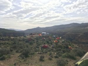 Twój namiot stanie dokładnie na wysokości 1400 m n.p.m. Ziemia rzeczywiście jest tu bardzo jałowa, skalista, więc fosy dookoła namiotu, na wypadek deszczu, bez kilofu czy młota pneumatycznego nie wyrzeźbisz. Płaskich miejsc jest jednak sporo. Przenośna toaleta, jeśli jeszcze nie stoi, to wkrótce przyjedzie. Koparka wykopała już głęboki rów pod jej podstawę.
